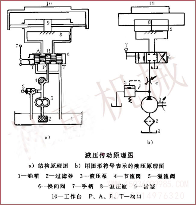 (1) 液壓傳動原理圖 由代表各種液壓元件、輔件及連接形式的圖形符號組成,用以表示一個液壓系統工作原理的簡圖,稱為液壓傳動原理圖。圖形符號有兩種表達方式:一種用結構示意圖,這樣的圖形比較直觀,元件的結構特點清楚明了.但圖形太繁鎖,繪圖麻煩;另一種是圖形符號圖,即把各類液壓元件用其圖形符號表示。